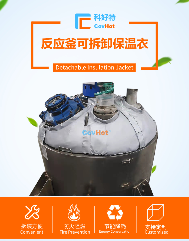 反應釜保溫衣,也可以叫做反應釜保溫套,反應釜保溫罩。反應釜保溫衣使用耐高低溫、防火保溫材料制作而成,拆卸安裝方便簡單,保溫隔熱性能高,可使高達500°C的反應釜表面溫度降低至50℃以下。